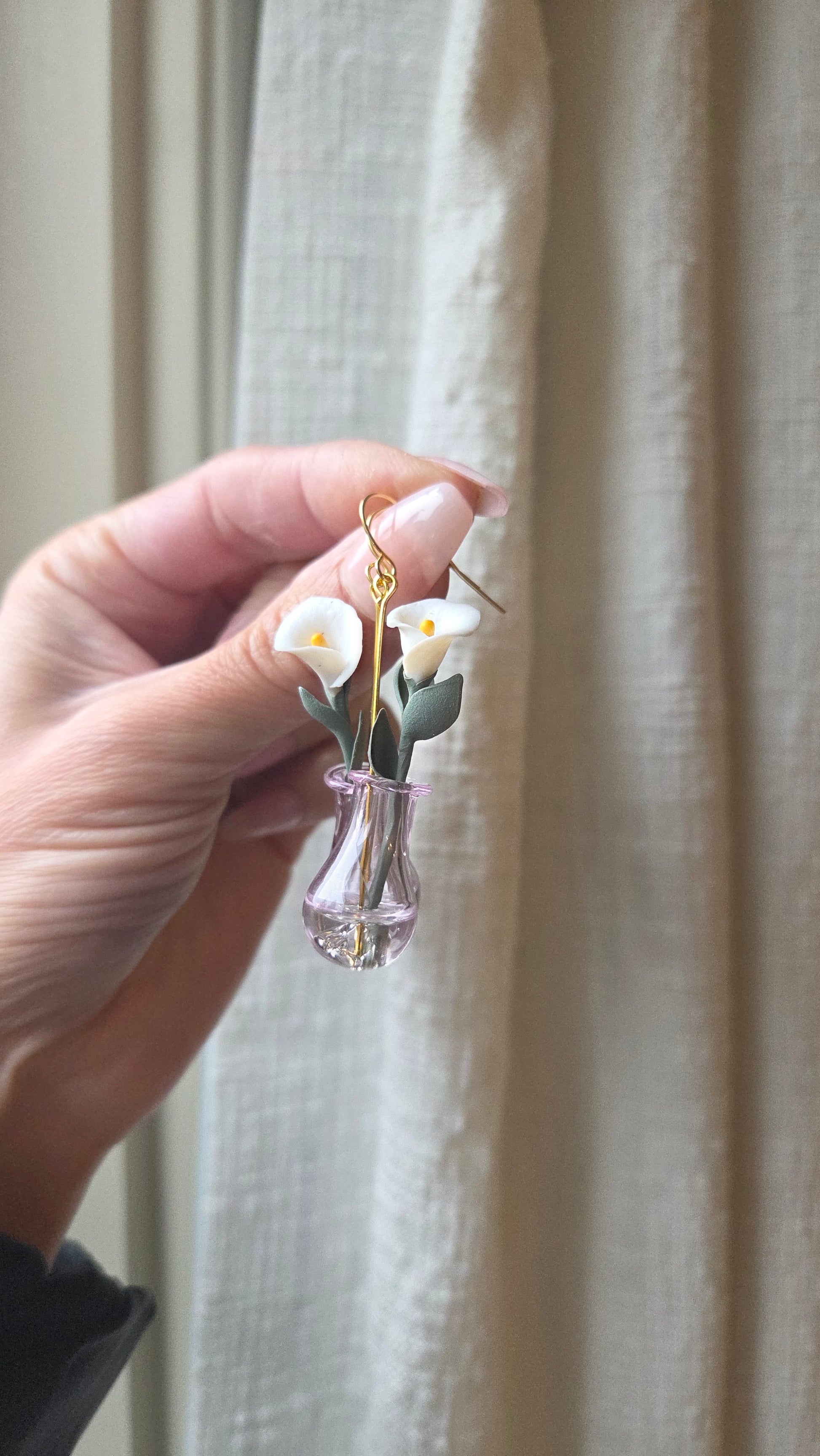 Handsculpted calla lilies using polymer clay, placed in a mini vase.